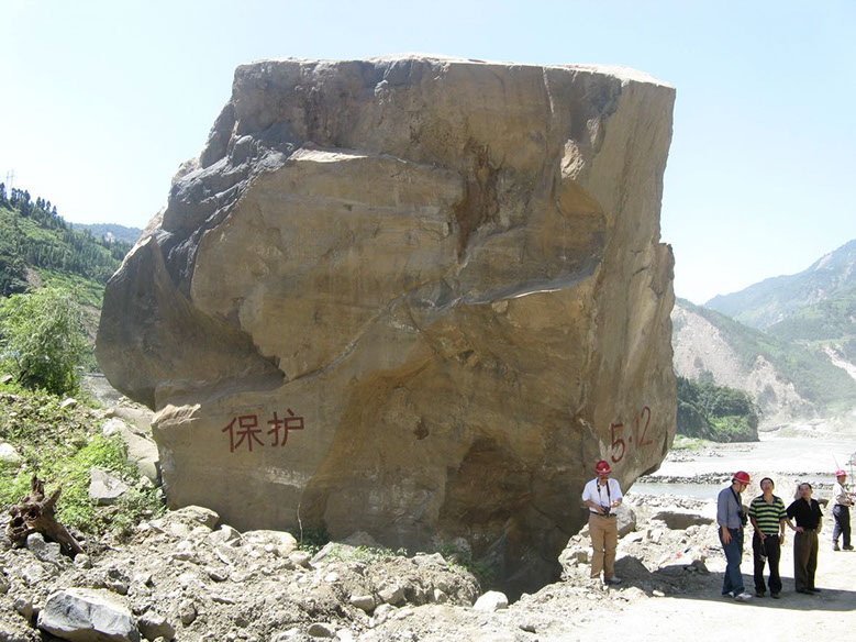 A large boulder dislodged during the 2008 earthquake, near the epicenter. The word on the rock translates to "protection" in English.