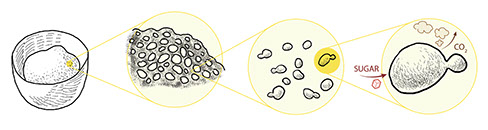 Sarah: But they also need to get rid of waste that is left over from the food they eat — carbon dioxide gas. And that has a lot to do with how yeast makes the dough rise.