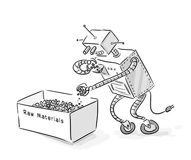 Then strange noises come from inside it—grinding, burning, gurgling, and hammering noises—while its internal machinery turns the useful elements of the raw materials into new robot parts. Those parts start coming out of Robot D like candy coming out of a snack machine, and the robot starts to put some of them together to make a new robot.