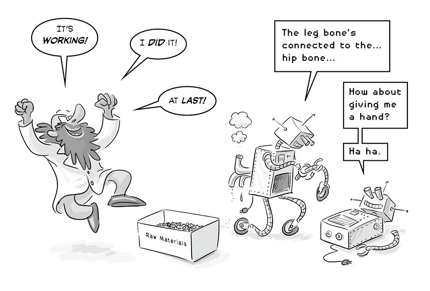 Dr. Otto realizes that Robot A has no operating instructions, because the small computer with memory that was supposed be installed was left out.