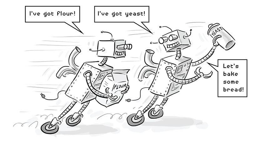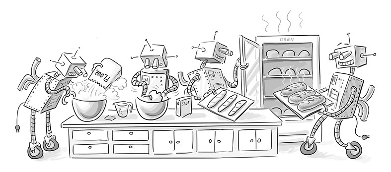 First the two robots take in raw materials so that they can start making new robot parts internally. Then, while their insides are churning away, they get to work baking bread. Dr. Otto beams with pride. “This is great! As long as my robots can repair and reproduce themselves faster than they break down, I’ll be able to stay in business forever.”