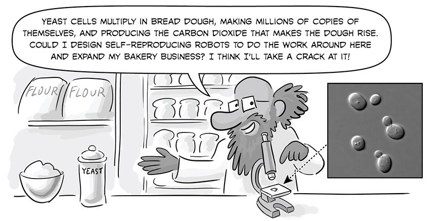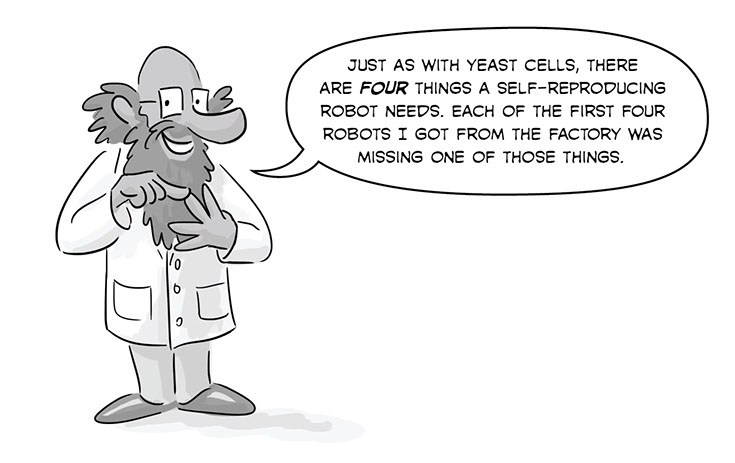 Upon close inspection, Dr. Otto notices that the robot factory overlooked a critical feature of his design. This mistake leaves out one of the basic abilities that both self-reproducing robots and yeast cells need.