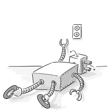 Robot C looks great at first. It goes to an electrical outlet and uses a built-in electrical cord to plug itself in. After getting charged up, it unplugs itself.