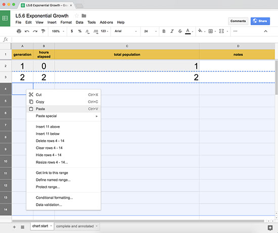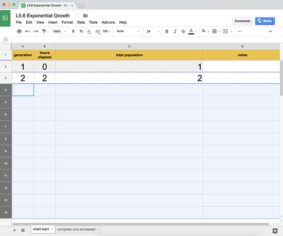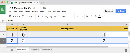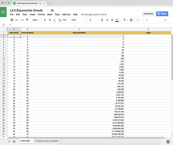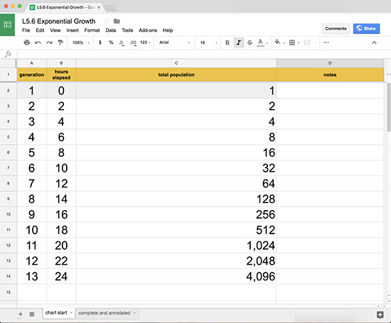 Step 4: Ta-da! The rows are filled to model exponential growth.