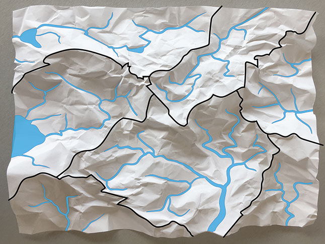 Students cut out and crumple the map provided and smooth it back out, leaving the ridges slightly raised. Students trace over ridge lines with a pencil. Before you allow students to spray their model with mist, ask them to predict what’s going to happen to the colors when they do.